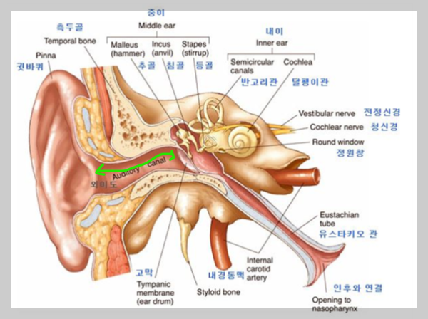 먼저 우리 귀속의 구조가 어떻게 생겼는지 알면 이해하기 쉽다. 흔히 우리가 말하는 귓구멍은 일자가 아니다. 아래사진처럼 약간 꺾여 있는 형태로 되어있고, 이런 기능은 귓속으로 물이나 이물질이 쉽게 들어가는 걸 방지한다.